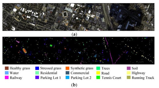 The Houston dataset was provided by the IEEE Geoscience and Remote Sensing Society (GRSS) for the Data Fusion Contest in 2013. This image is of the University of Houston campus and the neighboring urban area. The dataset has pixels with a spatial resolution of 2.5 m and 114 spectral bands coverage ranging from 380 nm to 1050 nm. This HSI contains fifteen classes of interest. Figure 6 shows the false-color composite of the Houston image and the corresponding ground reference map, respectively. The training and test samples were given according to the IEEE GRSS Data Fusion Contest in 2013. The spatial positions and the number of training and test samples for each class of interest is fixed by the IEEE GRSS Data Fusion Contest. Table 4 provides information on the number of training and test samples for each class of interest. It is important to note that the standard sets of training and test samples were used for the dataset to make the results entirely comparable with most of the methods available in the literature.