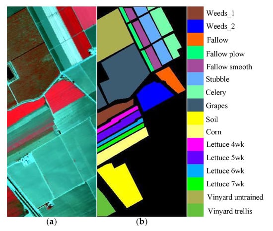 The Salinas dataset was acquired by the AVIRIS sensor over Salinas Valley, California. This image has pixels with a spatial resolution of 3.7 m and 204 spectral bands after removing 20 water absorption bands. This image contains sixteen classes of interest. Figure 8 shows the false-color composite of the Salinas image and the corresponding ground reference map.