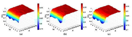 For the DMFA algorithm, we need to estimate the number of mixture components M and , and the dimensionality of latent factors and , in the first and second layer of DMFA, respectively. In the experiments, M is the same as in the MFA, , we set for all m in our experiments. is the same as d, . Five-fold cross-validation can be used to obtain the optimal parameters. To analyze the impact of the number of mixture components M and the dimensionality of latent factors in the first layer on the performance of DMFA, the output results of the first layer of DMFA were used for HSI classification. Figure 9c shows the OAs with respect to the values of parameters M and . Figure 9a,b show similar things for MFA and SMFA, respectively.