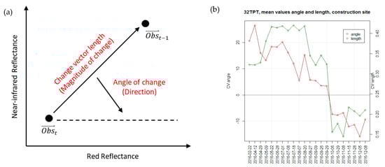 (a) Length and angle of the change vector in the red (band4)-NIR-space as used in the change detection analysis herein. (b) A time series of the mean values of angle and length for a typical construction site with the significant change occurring end of September 2016.