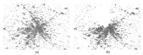 More frequent updating of LULC databases may be possible by taking advantage of new approaches to data capture. For example, the bottom-up citizen-led approach used in OpenStreetMap (OSM) is one example of a global map that is updated on a continual basis []. The involvement of citizens in such work is described by numerous terms [], notably Volunteered Geographic Information (VGI) [], crowdsourcing [] and/or citizen science [], and has revolutionized the acquisition of up-to-date geographical data. Although concerns with citizen-generated data abound, several studies have shown that OSM data are often equivalent to or even better in quality than data from traditional authoritative sources; see e.g., [,,]. However, OSM does not have complete spatial coverage. Moreover, class changes recorded in OSM may not always relate to actual changes in the LULC but may simply be a correction to the information or topological changes (e.g., relating to changes to the digitization or an import of objects). Despite these limitations, researchers have shown that OSM can be used to produce accurate LULC maps using a nomenclature such as CORINE or Urban Atlas []. Additionally, gaps in OSM data coverage may be filled by using LULC predictions obtained from the classification of remotely sensing imagery [].