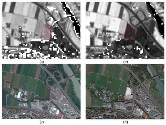 When combining multi-temporal or multi-sensor data (i.e., Sentinel 2A and 2B), image-to-image co-registration accuracy is very important, especially for pixel-based change detection methodologies to avoid false or pseudo change detection (see Figure 1). Although the overall multi-temporal geometric stability of Sentinel-2 is good (i.e., <0.3 pixels; []), slight shifts between images can occur, as has also been reported by the Sentinel-2 Mission Performance Centre through their monthly quality reports []. Therefore, as a second preprocessing step, a linear co-registration was applied to ensure the geometric correctness of each input image based on functionalities provided via the R-package RStoolbox []. Therefore, a master scene was identified based on the accompanying metadata. Thus, quality flags, coverage, date, and cloud-percentage are considered as useful indicators. All remaining scenes were then shifted/co-registered to the respective master scene using RStoolbox functionalities.