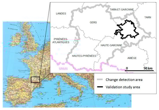 Toulouse and the surrounding pilot study area where the change detection algorithm and validation were applied (Basemap: GEOFLA Geoportal©IGN).