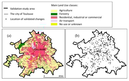 Location of the validation areas showing (a) the main authoritative Land Use (LU) classes (©IGN) and (b) the spatial distribution of the validated changes.