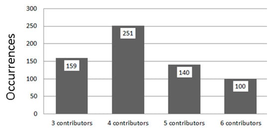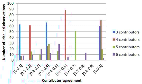 The degree to which contributors agreed in labeling sites was assessed using Equation 4 for all sites labeled by three or more contributors. All levels of agreement observed are depicted in Figure 9. We can observe that when six contributors labeled the same site, they are in perfect agreement very few times (four labeled sites only) and that the total disagreement (contributor agreement belongs to the interval [0-0.1[) occurs mainly where sites are labeled by three contributors (63 labeled sites). In contrast, contributor agreement is high (belonging to the interval [0.9-1]) where three or four contributors label the same site. Contributor agreement belongs to intervals [0.5-0.6[ and [0.6-0.7[ for four and five contributors, respectively. Based on this analysis, we can recommend that the total number of contributors labeling the same site should be between three and five.