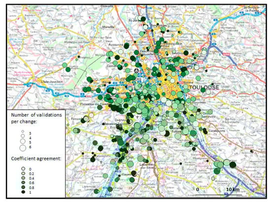 A major part of a change detection analysis is the validation of the predictions made. Best practice guidance for validation are available [] and can make use of VGI [,]. Here, validation was undertaken with the aid of two online tools: LACO-Wiki [], which is a generic land cover validation tool, and PAYSAGES [], which is a tool for collecting VGI to improve the LULC product of the French national mapping agency, IGN. They are used in a complementary way in this study. Both tools allow integration of fine-resolution imagery from different dates, which may be interpreted visually, and they provide a means to check if predicted changes are real or not. Moreover, the interpretation allows the change to be characterized more fully (e.g., labeling sub-classes of change) to enhance the value of the information. Here, the predicted changes were obtained from the LandSense [] change detection service (CDS), which encompasses different kinds of change detection algorithms, and is currently tailored for specific pilots as part of the LandSense project. Additionally, the reference data for the validation were obtained through a series of mapathons, which are organized events in which participants come together to undertake a mapping exercise over a concentrated time period. They are often used in the context of humanitarian mapping after a major disaster has occurred []. Thus, the visual interpretations used to form the reference data were acquired by contributors, where contributor groups comprised different contributor profiles, including a range of stakeholders such as administrative employees of the national French mapping agency (IGN), participants from local authorities such as the Urban Planning Agency from Toulouse who are users of the IGN LULC products, and engineering students from the National School of Geographic Science (ENSG). Although VGI from the ‘crowd’ has been used successfully in the past to validate LULC maps, e.g., forest cover [,,] and cropland [], VGI for the validation of change represents a new area of investigation and one that has great potential for the monitoring of change more generally. This potential, using data from different groups of volunteers who differ in terms of their relevant knowledge and skills, is explored in this paper.