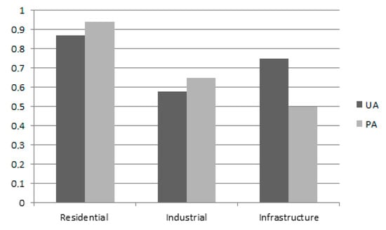 The OA was determined to be 0.81. The user’s and producer’s accuracies are depicted in Figure 11. We can notice that both the UA and PA are greater than 0.85 for the Residential class. This means that the CDS is appropriate for detecting residential changes. The UA for the Infrastructure class is low, being equal to 0.5. This is not surprising given the difficulty in detecting Infrastructure usage.