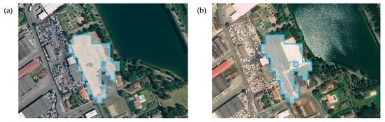 Example showing a change detected by the CDS as Industrial and considered as Industrial by the reference overlaid on an orthophoto for (a) 2016-Geoportal©IGN and (b) 2019-Geoportal©IGN.