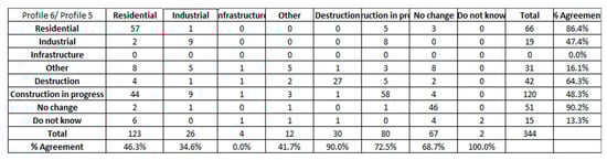 The two profiles have a relatively good agreement for the No change and Residential classes. Small agreements are obtained for Construction in progress and Industrial. For example, 44 of the changes (36%) assigned to Residential by Profile 5 were assigned to Construction in progress by Profile 6. This is an interesting example that illustrates that the experts analyzed the spatial context even when the construction was not completely finished in order to “guess” what the LU type of construction could be. Note that these are also local experts who know the study area. Moreover, we learned that during the mapathon involving participants from Profile 5, the contributors used LULC data to interpret the change and they discussed these changes between them. Finally, a relevant difference exists for the class Unknown: 13.3% against 100%. This demonstrates that the experts tried to label each site, even when it was difficult to assign a LU type.