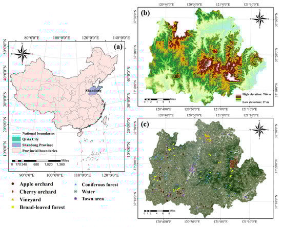 The city of Qixia, Shandong Province, China, was selected as the study area. This city is one of the main apple-producing areas in China. Qixia is located between 37°05’–37°33’ N and 120°33’–121°15’ E and covers an area of approximately 2016 km2 (Figure 1). This area is characterized by a temperate continental monsoon climate with a total annual rainfall of 650 mm and an annual mean temperature of ~11.3 °C. The city is dominated by hills and has an average elevation of 178 m above sea level. The annual cumulative sunshine hours are 2690 h. The temperature difference between day and night is large in the autumn, and the soil and environmental conditions are very suitable for apple growth. In addition to apples, the area also contains cherry, grape, pear, and peach cultivation, as well as broad-leaved and coniferous forests.