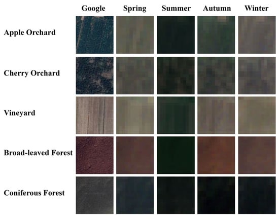Seasonal differences among major vegetation types in the study area. The first column of images shows Google Earth images; the second to fifth columns show the Sentinel-2 images of spring, summer, autumn, and winter, respectively.