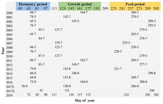 The remote sensing images used in this study were Sentinel-2, Landsat TM/ETM+/OLI, and MODIS Terra Vegetation Index (MOD13Q1) products. The data set list of Sentinel-2 and Landsat is shown in Figure 3. In this paper, we name the satellite image data by measuring the number of days between the shooting time of the satellite image and the 1st of January of the year.