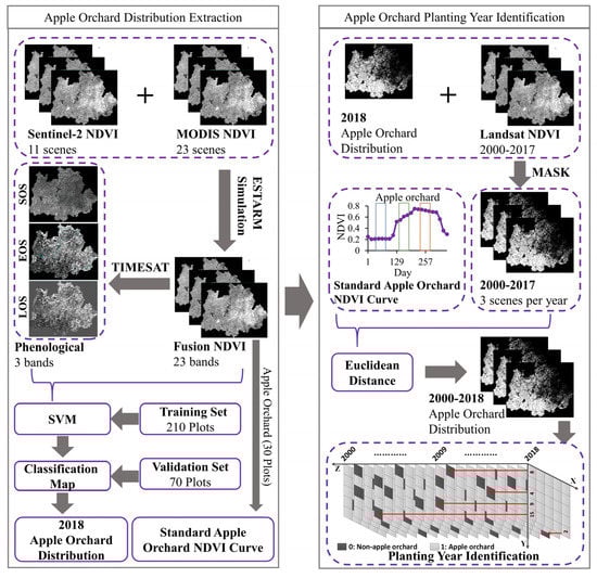 This paper proposes a new method for the identification of the planting year of apple orchards on a regional scale. This method is implemented in two steps: (i) extract the spatial distribution of apple orchards. In this step, the ESTARFM algorithm is used to fuse simulated 2018 Sentinel-2, and MODIS normalized difference vegetation index (NDVI) images to generate NDVI time-series data. By combining the fused image with phenological vegetation features generated using the TIMESAT 3.3 toolbox, an SVM supervised classification method was used to extract the spatial distribution of apple orchards; (ii) identification of apple orchard planting year. Using region of interest (ROI) data for different vegetation types (apple orchard, cherry orchard, vineyard, coniferous forest, and broad-leaved forest) obtained from a field survey, the NDVI time series were extracted from the Sentinel-2 NDVI spatiotemporal fused image. Among these NDVI time-series curves, three phenological characteristic periods that can be used to determine the distribution of apple orchards were selected, and the NDVI time series of the apple orchard was used as a template for extracting the apple orchard distribution. Then, the spatial distribution of apple orchards in 2018 was defined as the area of interest in the planting year, and Landsat NDVI time-series images composed of three phenological characteristic periods from 2000 to 2017 were masked, respectively. Subsequently, according to the apple orchard template, the distribution area of apple orchards from 2000 to 2017 was calculated using the Euclidean distance (ED) method. Finally, the pixel-by-pixel inverse time series calculation program developed in the MATLAB software was used to obtain the planting year distribution of apple orchards in 2018.