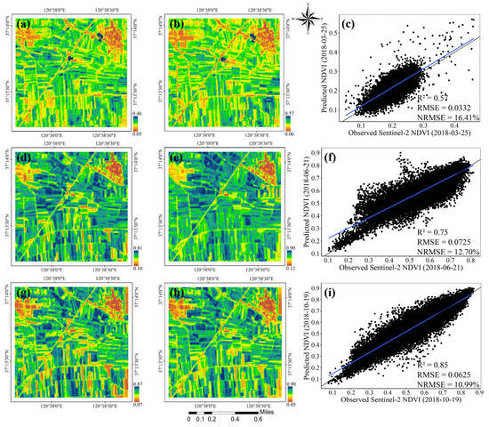 Verification of the accuracy of normalized difference vegetation index (NDVI) images fused using the enhanced spatial and temporal adaptive reflectance fusion model (ESTARFM) method. In the figure, the horizontal axis from top to bottom indicates three different seasons: spring (a–c), summer (d–f), and autumn (g–i); The vertical axis from left to right indicates the observed NDVI images (a,d,g), the fused NDVI images (b,e,h), and the verification result (c,f,g).