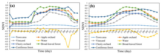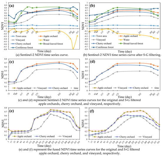 Figure 6 shows the original NDVI time series curves for the seven land cover types before and after filtering. From the figure, it can be seen that the filtered NDVI time-series data maintains good consistency with the original NDVI data. Compared with the original NDVI time-series data, the filtered curve better shows the seasonal variation trend of different land cover types. Regarding the NDVI time series curves of different land cover types, the NDVI values for urban areas and water are relatively low compared to those of vegetation. Apple orchards, cherry orchards, vineyards, and broad-leaved forests have similar NDVI values, with NDVI values first increasing and then gradually decreasing. However, during the growth period of 145 to 193 days, broad-leaved forests higher NDVI values compared to apple orchards and cherry orchards, and vineyards have the lowest. Furthermore, during the maturity period of 209 to 289 days, the NDVI values of apple orchards are always higher than those of cherry orchards. Coniferous forests maintained a high NDVI value throughout the growth cycle, with only slight fluctuations.