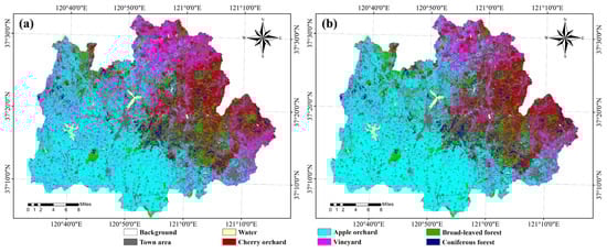 Figure 9 shows the estimated regional distribution of the seven vegetation types. It can be seen that apple orchards are mainly distributed in the hilly areas in the southwest of the study area, cherry orchards are mainly distributed in the eastern mountainous areas, and vineyards are distributed in the plain areas in the northeast and southeast. Broad-leaved forests are mainly distributed in high mountainous areas. In terms of areal coverage, apple orchards are the main vegetation type, covering an area of 96,600 hectares (accounting for 48.17% of the total area of Qixia City). The planting areas of cherry orchards and vineyards are 37,880 and 19,326 hectares (18.89% and 9.64% of the total area), respectively. Coniferous forests have a distribution area of 19,913 hectares (9.93% of the total area), while broad-leaved forests have the smallest distribution area, covering an area of 7733 hectares (3.85% of the total area).