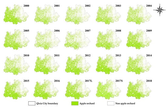Distribution of apple orchards from 2000 to 2018. The distribution for 2000–2017 was extracted using the ED method, and the distribution for 2018 was obtained from the land cover classification results in Section 3.3. Among them, 2017L and 2017S represent the data of Landsat and Sentinel-2 in 2017, respectively.