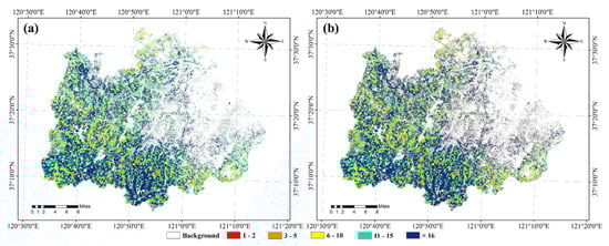Map showing the estimated planting year of apple orchards. (a) Recognition results obtained using only the Landsat data from 2000–2017; (b) Recognition results obtained by replacing Sentinel-2 data during the same period with 2017 Landsat data.