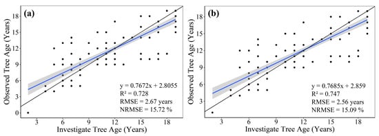 Accuracy verification of the estimated planting year of apple orchards. (a) Verification results obtained using only the Landsat data from 2000–2017; (b) Verification results obtained by replacing Sentinel-2 data during the same period with 2017 Landsat data. The black line represents 1:1 line, and the blue line represents the fitting line between the investigated planting years and the observed planting years.