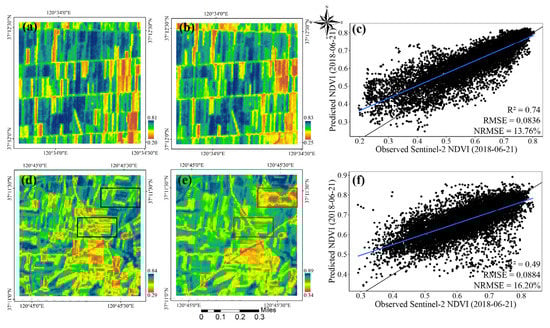 Differences in spatial heterogeneity of orchard distribution on the accuracy of fusion NDVI images. In the figure, the horizontal axis from top to bottom indicates two different plots: homogeneous plot (a) and (b), plot with spatial heterogeneity (d) and (e); The vertical axis from left to right indicates the observed NDVI images (a) and (d), the fused NDVI images (b) and (e), and the verification result (c) and (f); The black-framed area in (d) represents the real NDVI image, and the red-framed area in (e) represents the abnormal NDVI fusion image.