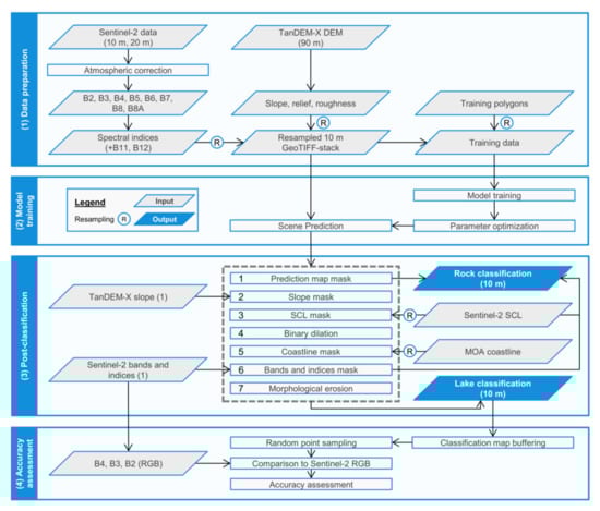 The whole workflow for automated supraglacial lake mapping is shown in Figure 2. Accordingly, it can be divided into (1) data preparation, (2) image classification, (3) postclassification and (4) accuracy assessment. Unless indicated otherwise, all processing was done using the Python programming language. Before providing a more detailed insight into the applied datasets and methods, the following section summarizes the study sites selected for model training and testing.