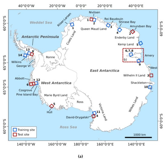The selection of study sites was based on known supraglacial lake locations (e.g., [20,21,34,47,48,49]) as well as the visual inspection of satellite imagery on Google Earth Engine. To ensure the spatial transferability of our supraglacial lake detection algorithm, we selected training and test regions evenly distributed across Antarctica containing information on all different types of environments and surface conditions. These include blue ice, wet or slushy snow in lower elevations, dry snow in higher elevations, deep and shallow supraglacial lakes as well as regions that are heavily crevassed or spotted with rock outcrop. For temporal transferability, we additionally restricted our study site selection primarily to occurrence of supraglacial lakes during the summer melt seasons of year 2019 for training regions and years 2017 and 2018 for test regions. This resulted in 14 training regions and eight spatially independent test regions (see Figure 3a, Table 1). Of the training areas, 11 were located on the East Antarctic Ice Sheet (EAIS), representing the largest of all three Antarctic regions, one was on the West Antarctic Ice Sheet (WAIS) and two covered regions on the API. Of the test sites, four were located on the EAIS, three on the WAIS and one on the API.