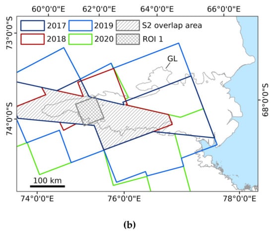 As visible in Table 1, each training and test region corresponds to one Sentinel-2 granule. In detail, the selection of Sentinel-2 imagery was based on the following criteria. First of all, we only considered imagery with cloud coverage less than 10% and acquired at sun elevation angles larger than 20° (see [40]). Second, to ensure the temporal transferability of our algorithm also during one individual melt season, the 14 Sentinel-2 training granules were chosen to include dates between early and late January 2019 (Table 1). On the other hand, to evaluate the temporal transferability of our algorithm, the eight test granules were selected to cover dates during the melt seasons of 2017 and 2018 (Table 1). Accordingly, 84 additional Sentinel-2 acquisitions were selected for employing our workflow for large-scale application over Amery Ice Shelf (Table S1), where we calculated maximum lake extents for four consecutive melt seasons (2017, 2018, 2019, 2020). As Level-2A Bottom-Of-Atmosphere (BOA) data over Antarctica are only provided since December 2018 [51], all Level-1C Top-Of-Atmosphere (TOA) data of 2017 and 2018 were corrected for atmospheric effects using Sen2Cor, a processor for retrieval of surface reflectance developed specifically for Sentinel-2 [52,53]. Table 1 lists the Sentinel-2 acquisitions selected for model training and testing and Table S1 the acquisitions covering Amery Ice Shelf. On the other hand, Figure 3b illustrates the coverage of Sentinel-2 granules for all regarded melt seasons over Amery Ice Shelf as well as their areal overlap and ROI 1, selected for quantitative analysis in Section 3.2.2.