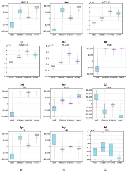 Following a discrimination analysis of the reflectance properties of water, snow/ice, rock and shadow on ice (Figure 4), only Sentinel-2 bands 2-8A were included for classification (Table 2). In addition, the selected Sentinel-2 bands as well as bands 11–12 were used to derive spectral indices to be fed to the classifier. In this study, we calculated 12 different indices for each granule out of which 11 were collocated from external reference studies and one was formulated as part of this study. First, the NDWI indices (NDWI1, NDWI2) [30,54,55], the New Water Index (NWI) [56], the Tasseled Cap for wetness (TCwet) [57,58] and the Automated Water Extraction Index with the option of shadow (AWEIsh) or dark area removal (AWEInsh) [59] (Figure 4i–n) were derived to support the classification of open surface water. Second, the modified Soil-Adjusted Vegetation Index (SAVImod) [60], the Soil/Water Index (SWI), the Modified NDWI (MNDWI) (or Normalized Difference Snow Index (NDSI)) [61,62], as included in the European Space Agency’s (ESA) Cloud/Snow Detection Algorithm [63] and the Normalized Difference Glacier Index (NDGI) [64] were included as training variables in order to support the identification of mainly rock and ice (Figure 4o–r). Third, the NWI, the SAVI, the AWEIsh as well as an additional modified Shadow Index (SImod) [65] (Figure 4k,l,r,s) were included for a better differentiation between shadow on ice and water, having almost identical reflectance properties in most of the bands/indices (Figure 4). Finally, the Normalized Difference Index (NDI) (Figure 4t) was formulated as part of this study and was added with the intention of providing further spectral information supporting the discrimination between all classes. Table 3 lists all derived indices as well as their mathematical formulations.