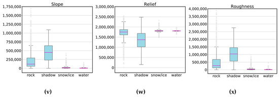 Distribution of pixel values according to their class membership. (a) B2: Blue reflectance. (b) B3: Green reflectance. (c) B4: Red reflectance. (d) B5: Red Edge 1. (e) B6: Red Edge 2. (f) B7: Red Edge 3. (g) B8: NIR. (h) B8A: Red Edge 4. (i) NDWI1. (j) NDWI2. (k) NWI. (l) AWEIsh. (m) AWEInsh. (n) TCwet. (o) NDSI. (p) SWI. (q) NDGI. (r) SAVI. (s) SI. (t) NDI. (u) DEM. (v) Slope. (w) Relief. (x) Roughness. The boxplots show the interquartile ranges, the median, the range of the data as well as outliers. In (a–h), the y-axes show the Sentinel-2 surface reflectance values for each band and in (i–t) and (u–x), the y-axes represent normalized indices and scaled representations of the topographic layers respectively.