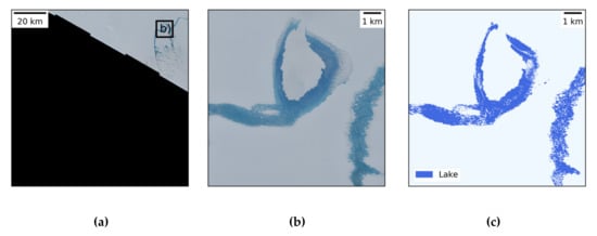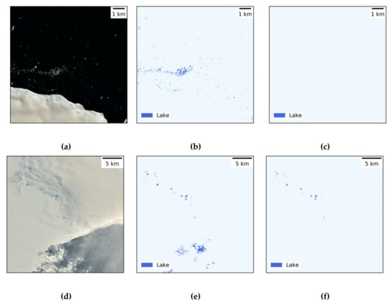 To improve our classification accuracies, more training data, e.g., on shadow on ice below thick clouds as well as on particularly shallow supraglacial lakes could be introduced during model training. On the other hand, to eliminate some of the mentioned error sources, more up-to-date DEM data would be required. For instance, the 8-meter Reference Elevation Model of Antarctica (REMA) could provide higher spatial resolution elevation data for both model training and postclassification [84]. Yet, the current REMA release still contains gaps and is generated from data covering the period 2009–2017 thus would likewise introduce errors during slope thresholding. Similarly, the use of the 2013/2014 MOA coastline during postclassification could introduce false lake pixels over ocean (see Figure 7b) or even cause the masking of true lakes pixels, e.g., where the calving front retreated inland since 2013/2014 or where it strongly advanced. Even though this did not affect the classification results over the test regions, more timely coastline data would be desirable to prevent the described effects. In this context, automatically derived calving fronts from Sentinel-1 data over Antarctica (e.g., [85]) could be a valuable data source.