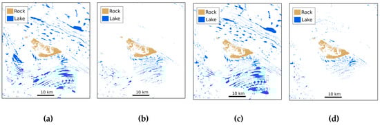 Maximum lake extent and rock outcrop maps for ROI 1 over Amery Ice Shelf during the 2017 (a), 2018 (b), 2019 (c) and 2020 (d) melt seasons.