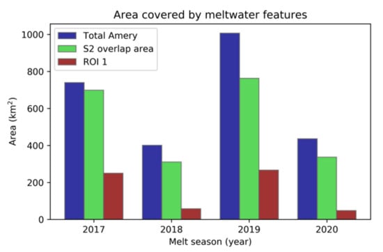 The classification maps over Amery Ice Shelf revealed highly varying supraglacial lake extents for all regarded melt seasons (Figure 8 and Figure 9). Considering the Sentinel-2 overlap area shown in Figure 3b, maximum lake extent was computed at ~699 km2, ~311 km2, ~763 km2 and ~337 km2 during the 2017, 2018, 2019 and 2020 melt seasons respectively (Figure 9). For ROI 1, a similar pattern was observed and the areal extent of supraglacial meltwater features was highest in 2017 and 2019 and lowest in 2018 and 2020 (Figure 8 and Figure 9).