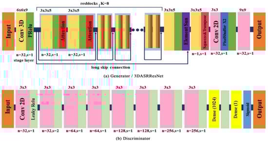 Figure 2, in which a very deep ResNet with eight blocks is used, and each block has an identical layout. Before the deep network in the generator, there is a stage of convolution layer with larger kernels. According to previous research, using a larger kernel layer before the deep network can usually help the network achieve a better result. There is a one-kernel 3D convolution layer that follows the resblocks, and it is used to make the number of channels of the output equal to 1 again. Additionally, a squeeze operation was used to transform the 5D output tensor into a 4D tensor. To enhance the resolution of the input HSI cube, a sub-pixel convolution layer is used in the network. The sub-pixel network was based on 2D convolution; therefore, the input needed to be a 4D tensor. In 2D convolution, the cube is described as a 4D tensor