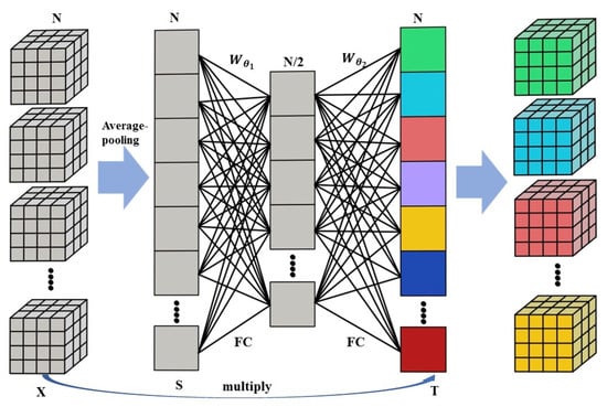 l is the index of the features, C, H and W are the band number, height and width of the tensor. After the average pooling layer, two thin fully connection layers (nonlinear transformation FC layers) are connected, which have a number of neural cell of N/2 and N, respectively. A sigmoid layer was applied to the output vector to make sure every value was in the range of 0 to 1. Thus, this vector