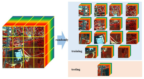 We trained all the networks on an NVIDIA GeForce GTX 1070Ti GPU. We split the DC Mall dataset into 16 equal parts, randomly chose one for testing, and used the rest and their correlative LR for training. For the Urban dataset, every part has 75 × 75 × 210 pixels. For the DC Mall dataset, every part has 150 × 160 × 224 pixels, as shown in