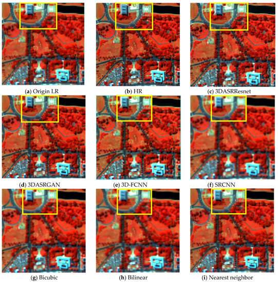 Figure 6e–i, the range of pixels occupied by the single-vehicle is larger, and the color of the pixels is closer to the color of the road, which means that it is more difficult to identify the vehicles. Some parts of the roads are difficult to be separated from the vegetation. The restoration of the vegetation is also considered. Because there are some different types of vegetation in this area, the shade of the color should be different; there are also some shadows within the vegetation part. In 3DASRGAN’s result, the heterogeneity among the pixels representing vegetation is the most evident. We can see the light and dark red portions, which represent different types of vegetation, and the parts under the shadow are quite easy to distinguish from the vegetation. Among the results of deep-learning methods, the difference within the vegetation is also clearly presented, although the best effect goes the result of 3DASRGAN. Furthermore, among the results of traditional methods, the difference between the vegetation, even that under the shadows, is not evident, which indicates that these methods are not effective in identifying the plant types. Thus, from the detailed part, it is clearly showed that SRGAN has the best visual impact.