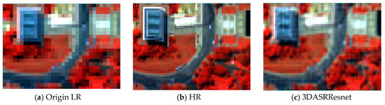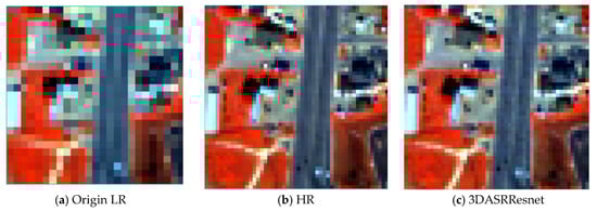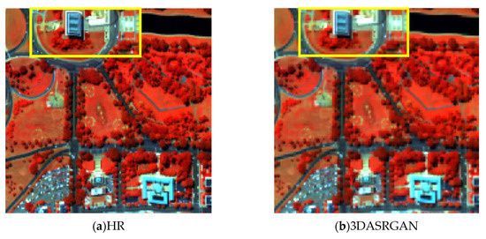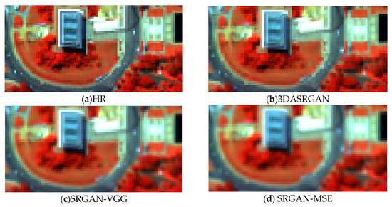 Figure 16c,d. In these results, the visual effect in 16c is slightly better than 16d, which is best illustrated by the shadows on the building’s roof and those of trees. However, the difference is not distinct. To some extent, this shows that the content loss constructed by VGG has no obvious effect on the HSI SR. The result of 3DASRGAN in 16b performs a little better and it is more similar to the HR image. The edges of the building are more distinct, the shadows of the trees and buildings are darker and more distinguishable. Spatial heterogeneity shows better in 3DASRGAN results. Nevertheless, the disparity between the results of 3DASRGAN and SRGAN have some difference in detail from the HR image. The similarity among SRGAN-VGG, SRGAN-MSE, and 3DASRGAN in the spatial aspect means that the space reconstruction ability of 3DASRGAN is better.