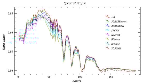 Figure 11, we can see that the red line is the closest to the deep blue line and the second-closest one is the green line, which means that the proposed 3DASRGAN model and 3DASRResNet model can create the most similar spectral information as real ground objects. For example,