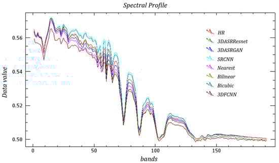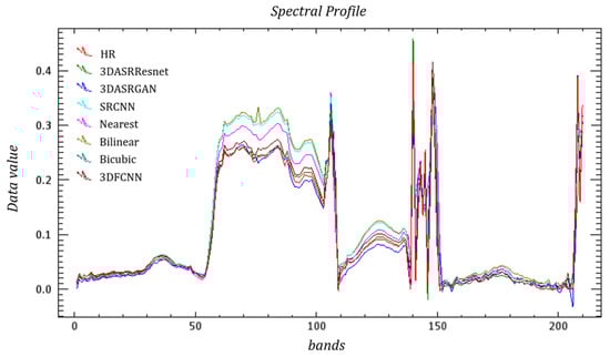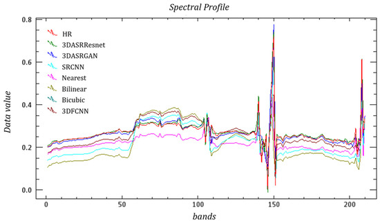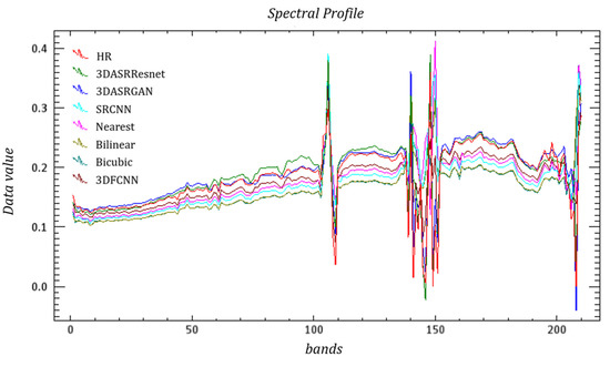 Figure 14, the red lines are closer to both the deep blue and green lines. Therefore, the results obtained from both the 3DASRResNet and 3DASRGAN are effective because 3DASRResNet has the smallest SAM value and 3DASRGAN has the highest PSNR and SSIM values. Compared with these two methods, the spectral curves of other methods are quite different from those of real ground objects. Thus, the impacts are not very good.