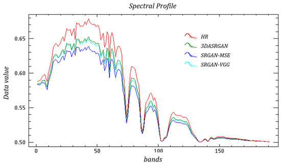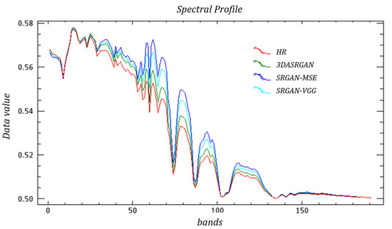 Table 3 shows the PSNR, SSIM, and SAM values of 3DASRGAN, SRGAN-VGG, SRGAN-MSE, and the HR image; our focus is the SAM value, which indicates the disparity of these methods. The SAM values of SRGAN-VGG and SRGAN-MSE are approximately the same, and they are both too high, which means that the spectral restoration ability of VGG and MSE methods are both ineffective and the spectral distortion of these two methods are obvious. Compared to the SRGAN methods, the SAM value of 3DASRGAN method is much closer to 0. The smaller SAM value shows the spectral curves of 3DASRGAN are more similar to the HR image, and thus, proves a better spectral reconstruction ability.