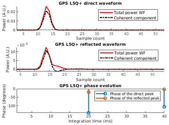 However, performing the cross-correlation, but now including the secondary code, and preserving the integration time (40 ms) has a direct impact on the DOC. As seen in Figure 8, the DOC of both direct and reflected signal goes up to ∼1, which means that, for the selected waveform, the coherency of the sea spectrum at L5 is preserved within 40 ms. Note as well the typical elongation of the trailing edge of the waveform (Figure 7, central panel), and that, in the reflected signal case, two coherent peaks can be identified. In addition, the phase evolution of the L5Q signal with secondary codes included can only be represented once every 20 ms, as the cross-correlation process and waveform retrieval is taken in multiples of the code length.