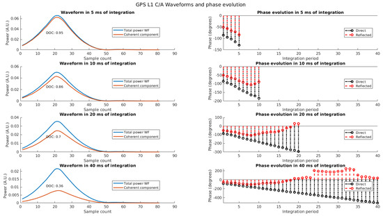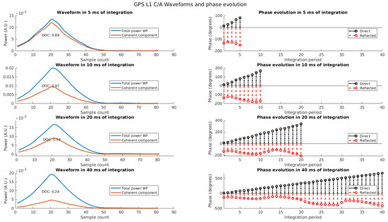 The GNSS reflected signal contains a portion of coherency, which is easily untangled from the incoherent one thanks to the proposed algorithm. A first example for GPS L1 C/A is provided in Figure 9 showing four different integration times: 5 ms, 10 ms, 20 ms, and 40 ms. As it can be seen, the DOC of the reflected waveform decreases as the coherent integration time increases. In addition, the phase of the peak is detailed for each 1 ms cross-correlation interval. Note that, the scale of the phase evolution has been set the same for the four measurements to ease its visualization.