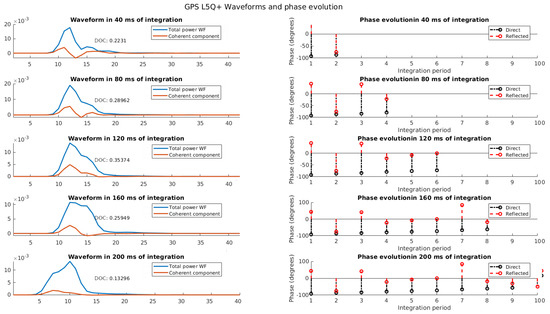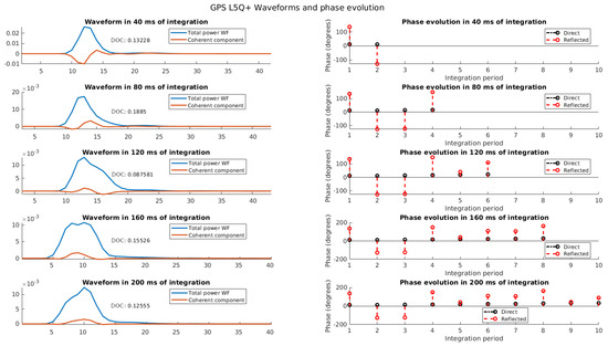 Left column: Total power waveform and coherent component for different integration times (from 5 to 40 ms). Right column: phase evolution of GPS L5Q direct (black) and reflected (red) signals for the 20 ms coherently integrated waveforms used for different integration times (from 40 to 200 ms).