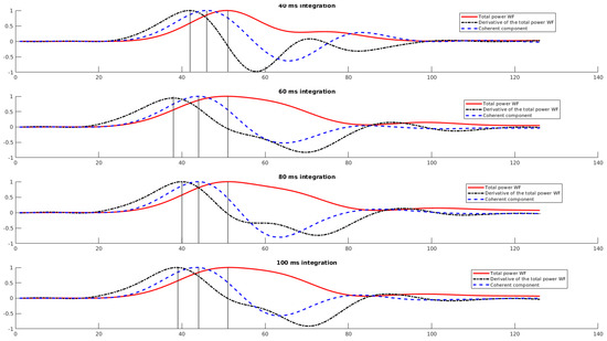 For the four cases, 40, 60, 80, and 100 ms of integration time, the coherent component peak position is found in five samples for the 40 ms case, and seven samples for the next three cases before the peak of the total power averaged.