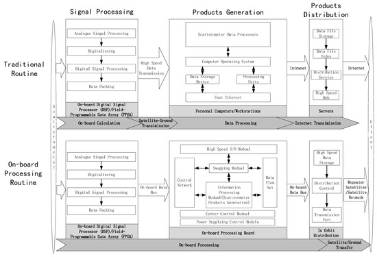 The space-borne scatterometer is an implementation of real aperture radar, with capability of obtaining better accuracy and precision of the received power measurement [32]. These scatterometers transmit and receive the backscattered signals from the ocean surface. Received signals are detected and processed as digitalized power values, together with noise measurements and auxiliary data describing observing geometry and polarization; they are then transferred to ground stations [33,34]. Wind products are obtained with computers distributed in institutes or agencies before being provided to application end-users. The proposed on-board environment integrates traditional observing and ground processing chains for wind products. Figure 1 illustrates both routines.