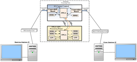 Processing modules and hardware implementations are also shown in Figure 1. The functions required for the on-board processing system can be realized from the control system, data processing, high-speed input–output (I/O), data storing, and swapping modules. The control module receives and interprets orders to specific tasks and sends them to other modules. The I/O module provides data interchange channels capable of meeting the speed of data observing and product generating. The swapping module manages data transmission flows between modules and processors within a module. These modules form the on-board processing environment. Digital signal processor (DSP), a field-programmable gate array (FPGA), and an embedded graphics processing unit (GPU) can be used to implement these modules. On an FPGA mother-board, together with two sets of Double-Data-Rate of version 3 (DDR3) Random Access Memory (RAM), FPGA chips realize I/O and control procedures. Data compression before transmission can also be done. Since the wind scatterometry requires multi-inputs and iterations in wind retrieval procedure, embedded GPUs or DSP are suitable choices to meet its requirements. In this research, an embedded Jetson TX2 GPU [35] was adopted for its better calculating ability and flexibility in applications. Together with FPGA chips that swap data with the GPU and the I/O module, the processing module was complemented, as illustrated in the middle part of Figure 2. Based on these settings, a specific on-board processor (SOBP) was designed and developed. The hardware scale of this SOBP is shown in Table 1. Its parameters indicate that it is suitable for satellite applications [36]. Results obtained on-board are downlinked in communication channels provided by communication satellites and broadband low Earth orbit (LEO) satellites [37]. For the validation of the on-board-scatterometer wind product generation algorithms proposed in this research, the simulation of the on-board environment was necessary. Figure 2 illustrates a simulated environment where the SOBP has the same set of parameters as described above. Differences with the actual on-board environment are for data input and product output only. Measurements with simultaneous auxiliary attributes of observations are provided by a personal computer (PC), while the result products are output to another instead of being downlinked for RT applications.