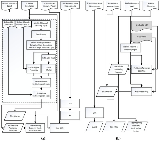 A scatterometer pre-processing procedure is implemented by the L1 processor. It generates L1 NRCS from L0 data. In traditional L0 processing steps, when noise that is simultaneously obtained with observations has been subtracted, the signal-to-noise ratio (SNR) can be calculated [34]. Following this comes a key step for pre-processing, i.e., eliminating observing geometry and antenna pattern effects. Generally, frequency modulation for each pulse is adopted for the enhancement of resolution, and different frequencies of return signals measured from the scatterometer are mapped to different ground distances. In a pulse, fast Fourier transform (FFT) bins can be divided into different slices. The number of slices is determined by beam width [40,41]. Doppler effects in frequency (Doppler frequency) are due to Earth’s rotation and sensor speed relative to Earth’s surface. When the Doppler frequency, center frequency shift, and frequency modulation slope of the signals are compensated for, the frequencies of a slice can be mapped to different slant range distances. Combinations of FFT bins of a return pulse into slices are achieved before forming L0 data in order to make sure each slice has the same ground coverage. In this procedure, the bin grouping is achieved with a look-up table (LUT) that provides an estimated Doppler frequency. This LUT is calculated according to predicted positions of scatterometer in its orbit. When an observation is conducted, differences of the true Doppler frequency with this LUT are estimated and compensated for in the L1 processor by considering the observing position. Together with antenna orientation, a slice location on the ocean’s surface and a corresponding antenna gain factor can be obtained. The factor that embodies the antenna gain effect with a specific geometry in observation is referred to as the calibration factor, namely the X-factor. When the value of signal power of a slice is divided by the X-factor, NRCS can be calculated. Then, their standard deviations (Kp) can be calculated when the NRCS of all slices are determined [34]. The whole procedure is shown in Figure 3a. The core algorithm is bordered by the dashed rectangle. It is used to calculate the discretized integrating for the X-factor in Equation (1) [40]: