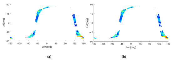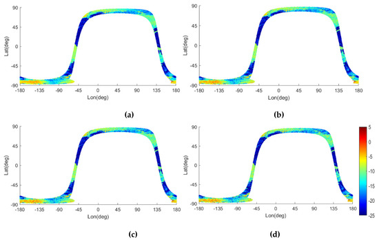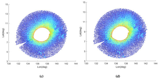 In this part, L1 products from on-board preprocessing are displayed, and then on-board wind inversion with a full resolution of the LUTs described in Section 3. When apply theseLUTS, that more time is required in the proposed on-board processing chainis illustrated. The sesampling of LUTs to a half and a quarter number of samples LUTs for geo-locating and the X-factor were applied to obtain the LUTs of fewer samples. The resampled dimensions of the LUTs were latitude and antenna azimuth angles. Comparisons were made with the full and smaller sample of LUTs. Figure 5 illustrates the ground L1 product and the on-board NRCS distributions of the track of data used in the experiment. Figure 6 illustrates a randomly selected pulse from data in Figure 5. The horizontal axes of both figures are longitudes in degrees, the vertical axes are latitudes in degrees, and color indicates amplitudes of the NRCS in dB. In both figures, the (a) sections are from ground products, the (b) sections are from on-board procedures in full resolution LUTs, and the (c) and (d) sections are from on-board products obtained in half and a-quarter sample numbered LUTs, respectively. From Figure 6, the differences in geo-locating and NRCS amplitude derivation differences are not obvious, though the (d) sections in Figure 5 and Figure 6 appear much noisier than the (a) and (b) groups. Taking the positions of L1 ground products as references, the root-mean-square error (RMSE) of the on-board results in the (b) of Figure 5 is 0.93 m, and the half number of sampling LUT results in (c) is 2.81 m, and 4.81 m for (d).