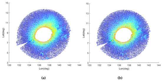 An L0 product from CFOSCAT that was received from the ground station was employed for the experiment to validate the proposed on-board processing method. CFOSCAT is the first rotating fan-beam scatterometer ever in space [43]. It was launched in October 2018 onboard CFOSAT. The data employed for this research were from 14th March 2019. Observations were obtained from 9:30 to 11:05, corresponding to a track of data received in the ground station. For the validation of the proposed method, accuracy evaluation was achieved by a comparison made with the ground-processed products [44].