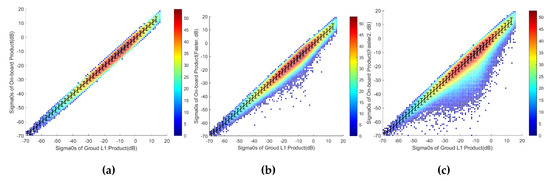 Correlation and error bars of NRCS for ground products (vertical axis) and on-board products (horizontal axis). Color indicates sample number density in dB. (a) illustrates results from LUTs in full resolution, and in in a half (b) and a quarter (c) number resampled LUTs.